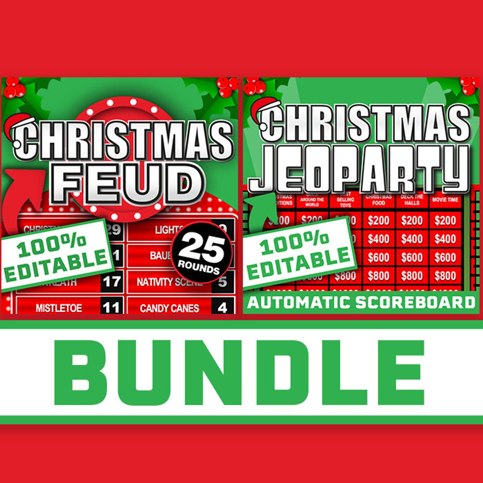 Christmas Family Feud and Jeopardy Games will make a fulfilled holiday family tradition. This game includes 25 ready to play rounds including a fast money round, automatic scoreboard, graphics and animations, and themed holiday music & sound effects. It is also editable is you want to change any of the questions.