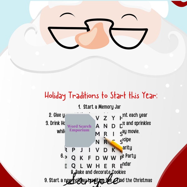 Printable ideas for holiday traditions that are simple and fun.Ideas include starting a memory jar, hide the Christmas pickle, and a word search.