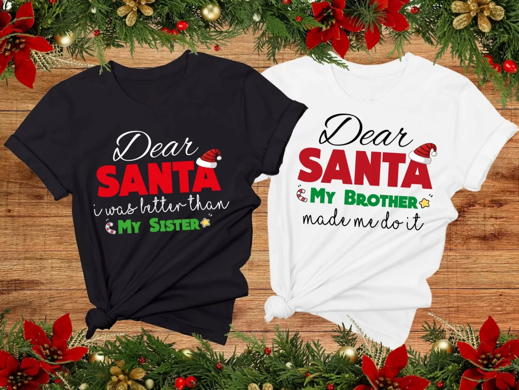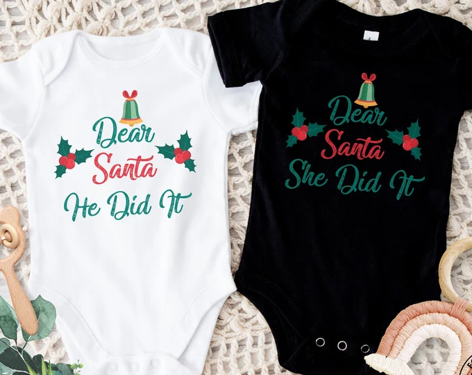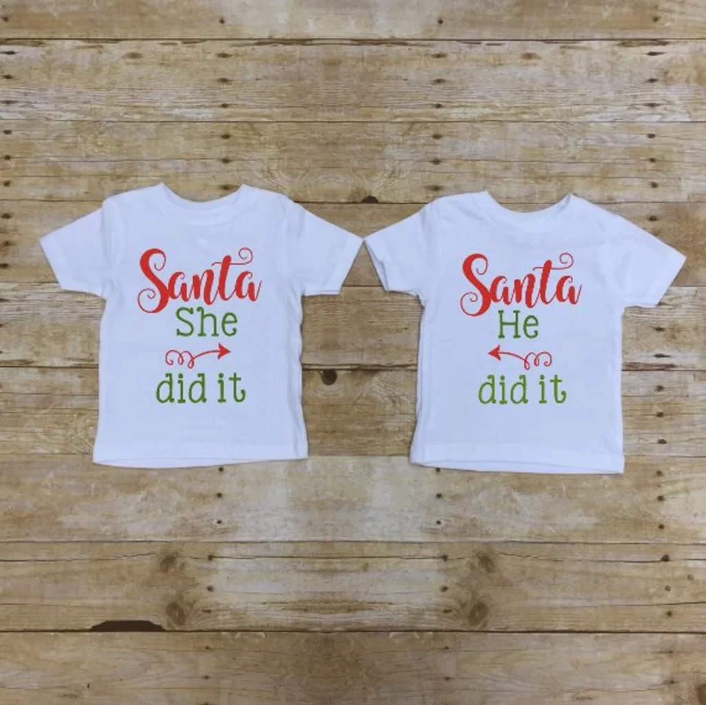 He Did It, She Did It Shirt These onesies are perfect for boy/girl twins. Add the perfect accessories and it’s perfect for taking pictures with Santa. Add a pair of corduroy pants for your boy twin, and a toddler tutu with a holiday hair band and leggings for your girl twin.