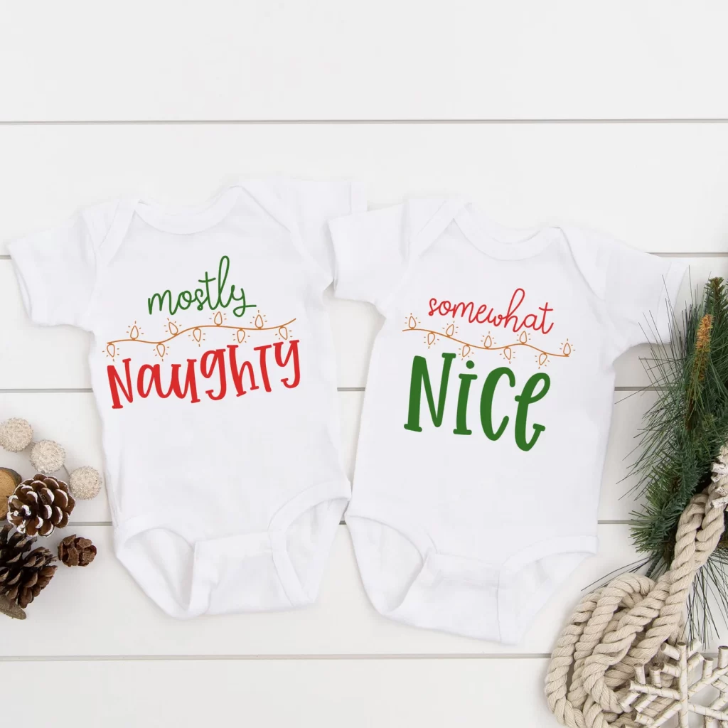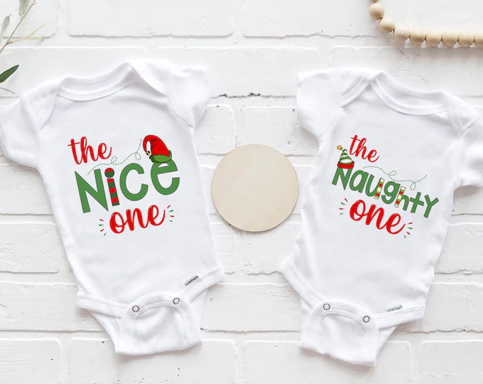 Mostly Naughty and Somewhat Naughty matching shirts. These shirts are easy to dress up for both or girls. Add some pants for your by twins or a Christmas tutu, Christmas headband, or leg warmers for your girl twins.