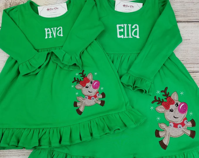 Girl Twins Green Reindeer Dress This festive green dress can be used with twin girls or siblings. Here are some accessories to go along with it.