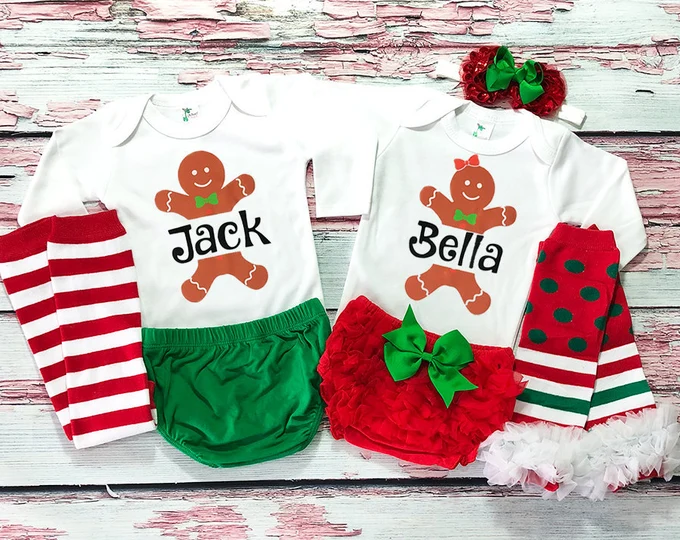 Gingerbread Boy And Girl If you are a fan of the gingerbread man and ruffles then this is the perfect holiday matching outfit for your twins.